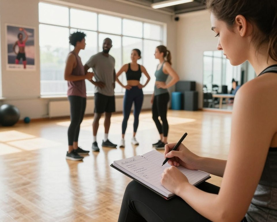 A peaceful and rousing fitness scene displays different people setting reasonable fitness objectives. In the closer view, an individual in comfortable athletic wear is scribbling down objectives in a scratchpad, communicating concentration and assurance. In the center ground, a small bunch examining their wellness plans are illustrating strong body language, including a blend of ethnicities to guarantee inclusivity. The foundation shows a shining and breezy exercise center with expansive windows that permit characteristic light to pour in, creating an inviting atmosphere. Delicate reflections on cleaned wooden floors improve the disposition, whereas motivational wellness blurbs embellish the dividers. The point captures a wide shot to envelop the community feel, emphasizing collaboration and inspiration in the interest of well-being and fitness.