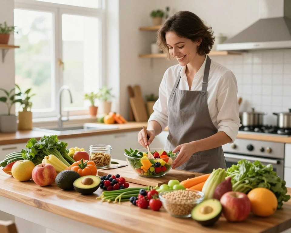 A shining, welcoming kitchen filled with new natural products and vegetables exhibits a colorful cluster of solid nourishment. In the closer view, a wooden table shows a bountiful spread of avocados, berries, verdant greens, and entire grains. In the center ground, a grinning person in proficient-commerce clothing plans a nutritious dinner, illustrating hands-on cooking strategies. The foundation highlights a sunlit window, emphasizing a clean and organized space, improving the feeling of warmth and inspiration. Delicate, common lighting surges through the kitchen, making a dynamic environment. The general temperament is enthusiastic and motivating, empowering a journey towards a more advantageous way of life through nutrition.