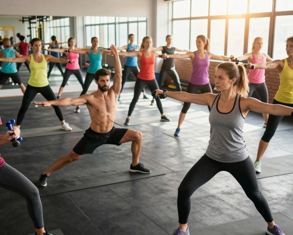An energetic exercise center setting with different people engaged in various workout schedules. In the closer view, a lady wearing proficient athletic clothing illustrates a strength-training workout with dumbbells, exhibiting assurance. In the center ground, a man performs yoga on a tangle, emphasizing adjustment and mindfulness. A dynamic group of people practicing vigorous exercise is unmistakable, creating a sense of community and vitality. The foundation highlights exercise center gear and mirrors, permitting a motivational environment. Characteristic light streams through numerous windows, casting a warm shine over the scene, complementing the dynamic colors of workout adaptation. The general temperament is motivating and enthusiastic, empowering watchers to grasp wellness as a crucial portion of their well-being journey.